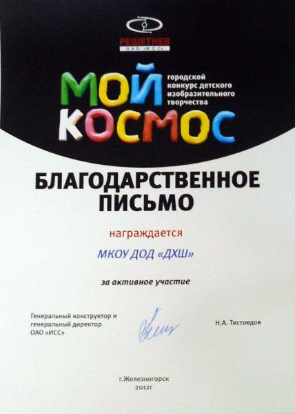19 мая 2012г в городском Музейно-выставочном центре состоялось подведение итогов и открытие выставки участников и победителей городского конкурса детского изобразительного творчества «Мой космос». Конкурс проводился совместными усилиями ОАО «ИСС» имени академика М.Ф. Решетнева, МБОУ ДОД "ДХШ", МКУК «МВЦ».